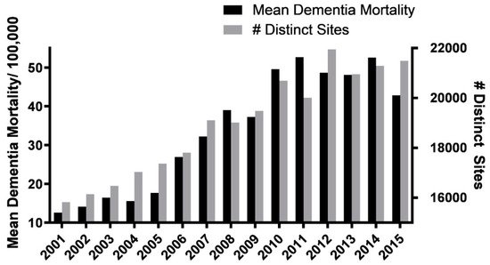 Distinct sites vs. mean mortality. Graphic illustration of nearly identical trajectories of increase in the numbers of distinct MTM sites (total sites) vs. the mean age-adjusted mining county vascular and unspecified dementia mortality rates/100,000 population between 2001 and 2015.