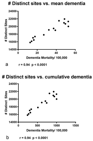 When a Pearson’s r correlation analysis of the data, depicted in Figure 6, was used to compare the two data sets, a significant positive correlation was found between the number of distinct sites per year vs. the mean age-adjusted dementia/100,000 population/year (Figure 7a; r = 0.946; p < 0.0001; 15 xy pairs). A similar analysis comparing the number of distinct sites to the cumulative age-adjusted dementia/100,000 population per year yielded identical results (Figure 7b; r = 0.946; p < 0.001; 15 xy pairs).