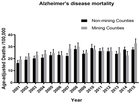 Alzheimer’s disease mortality in MTM vs. non-mining counties in West Virginia over the years spanning 2000–2015. The analysis did not find an effect of MTM on age-adjusted Alzheimer’s disease mortality/100,000 population (F = 0.38; df = 1, 52; p = 0.53). Likewise, there was no interaction between year and mining (F = 0.70; df = 14; 728; p = 0.76). However, similar to the finding for dementia mortality, a significant effect of year (F = 4.34; df = 14, 728; p < 0.0001) was found.