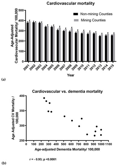 Since an increased risk of cardiovascular disease (CVD) in populations living in the vicinity of MTM has been previously reported [2] and cardiovascular disease is a significant risk factor for dementia [34,35], we also evaluated patterns of CVD vs. dementia mortality in mining vs. non-mining counties over the same 2001–2015 time span. Data concerning the age-adjusted mortality/100,000 population for Major Cardiovascular Diseases (I00-I78) for all West Virginia counties covering the years 2001–2015 were downloaded (4 April 2018) from the Center for Disease Control and Prevention CDC WONDER database [36]. No further adjustments to these data were made.