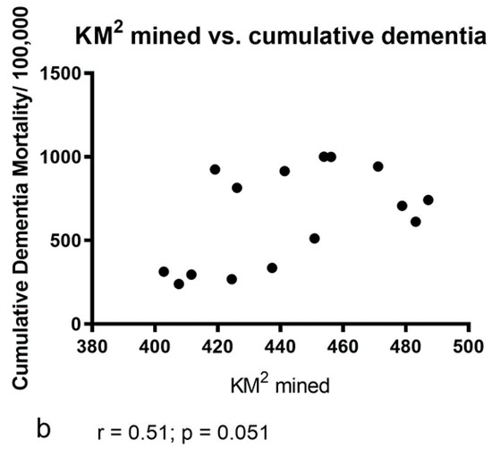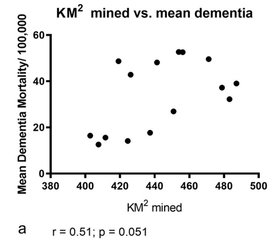 (a) No significant correlation was found between the extent of mining (km2) vs. the mean number of age-adjusted deaths from dementia/100,000 population (r = 0.51; p = 0.051; 15 xy pairs). (b) No significant correlation was found between the extent of mining (km2) vs. the cumulative number of age-adjusted deaths from dementia/100,000 population (: r = 0.51; p = 0.051; 15 xy pairs).