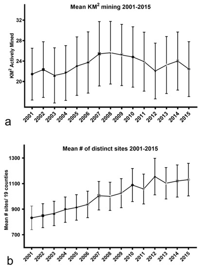 Mean km2 mined vs. mean distinct sites mined per year from 2001–2015. (a) Km2 mined remained relatively flat over the 15 year period whereas (b) the number of distinct sites rose steadily. Error bars = S.E.M.s.
