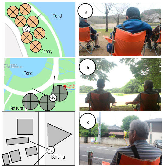 Schematic and photographs displaying the seated-viewing scenes: (a) urban park site in spring, (b) urban park site in early summer, and (c) city area site.