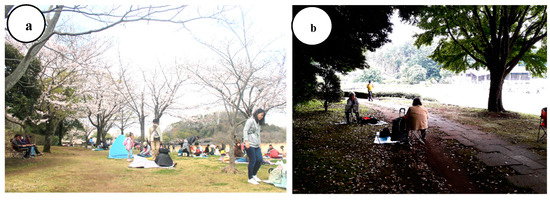 Seated-viewing experiment site in Forest and Park for the 21st Century: (a) cherry-blossom-viewing in spring; (b) leisure activities in summer.