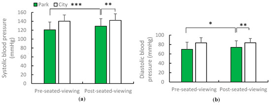 The average of blood pressure after urban park and city views in spring: a) systolic blood pressure and b) diastolic blood pressure. N = 12, mean ± standard deviation. * p < 0.05, ** p < 0.01, *** p < 0.001, determined by the paired t-test (one-sided).