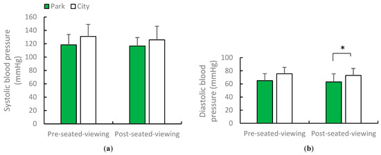 Average systolic and diastolic blood pressure after urban park and city views in early summer. N = 12, mean ± standard deviation. * p < 0.05, determined by paired t-test (one-sided).