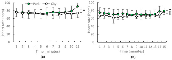 Average one-minute heart rate during urban park viewing in the: (a) spring and (b) early summer. N = 12, mean ± standard deviation. * p < 0.05, *** p < 0.001, determined by paired t-test (one-sided).