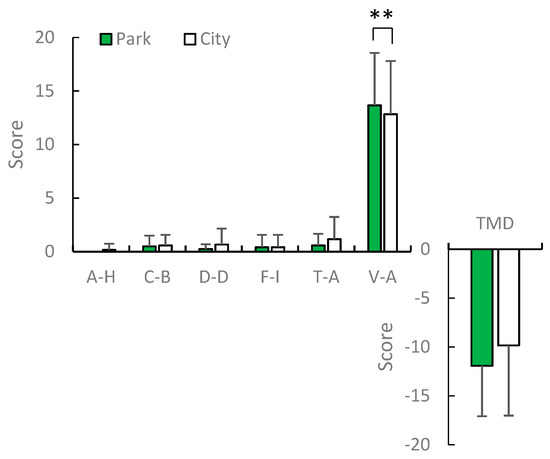 POMS scores after viewing in the urban park and city area in spring. A–H: anger–hostility; C–B: confusion–bewilderment; D–D: depression–dejection; F–I: fatigue–inertia; T–A: tension–anxiety; V–A: vigor–activity. N = 12, mean ± standard deviation. ** p < 0.01, determined by the Wilcoxon signed-rank test (one-sided).