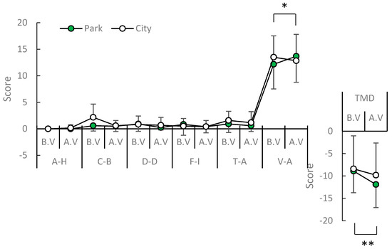 Comparison of POMS score pre and post-view in the urban park in the spring. A–H: anger–hostility; C–B: confusion–bewilderment; D–D: depression–dejection; F–I: fatigue–inertia; T–A: tension–anxiety; V–A: vigor–activity. N = 12, mean ± standard deviation. * p < 0.05, ** p < 0.01, determined by the Wilcoxon signed-rank test (one-sided).