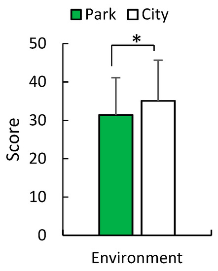 STAI score after seated-viewing in an urban park and the city in early summer. N = 12, mean ± standard deviation. * p < 0.05, determined by the Wilcoxon signed-rank test (one-sided).
