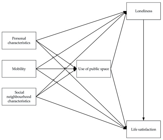The main aim of the current research was to analyze the relationships between personal, mobility, and social neighborhood characteristics and public-space use, loneliness, and life satisfaction. In addition, the effect of public-space use on loneliness and life satisfaction, and the effect of loneliness on life satisfaction, was studied. The results showed a significant relationship between loneliness and life satisfaction, but a limited effect of public-space use on loneliness and life satisfaction was observed. For life satisfaction, a relationship with active use was found. In addition, for loneliness, a relationship with passive use was found. The effect of passive use on loneliness indicates that the enjoyment of public-space visits is more important than the actual activities that are performed in the public space. Based on data collected using a questionnaire that was distributed via social media and meetings with community and elderly centers, 200 responses were retrieved, and a path model was estimated. As was shown, the RMSEA of the path model equaled 0.089, which is rather high. This may be caused by the large number of paths relative to a small sample (N = 200) [65].