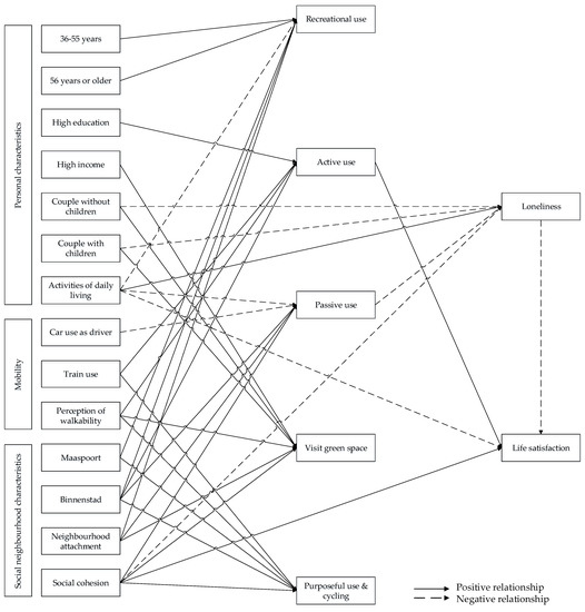Previous research has shown that personal, neighborhood, and mobility characteristics could influence life satisfaction and loneliness of people and that exposure to public spaces, such as green spaces, may also affect the extent to which people feel lonely or satisfied with life. However, previous studies mainly focused on one of these effects, resulting in a lack of knowledge about the simultaneous effects of these characteristics on loneliness and life satisfaction. This study therefore aims to gain insights into how public-space use mediates the relations between personal, neighborhood, and mobility characteristics on the one hand and loneliness and life satisfaction on the other hand. Relationships were analyzed using a path analysis approach, based on a sample of 200 residents of three neighborhoods of the Dutch city ‘s-Hertogenbosch. The results showed that the influence of frequency of public-space use on life satisfaction and loneliness is limited. The effects of personal, neighborhood, and mobility characteristics on frequency of use of public space and on loneliness and life satisfaction were found to be significant. Age and activities of daily living (ADL) are significantly related to each other, and ADL was found to influence recreational and passive space use and loneliness and life satisfaction. Policymakers should, therefore, mainly focus on creating neighborhoods that are highly walkable and accessible, where green spaces and public-transport facilities are present, to promote physical activity among all residents.
