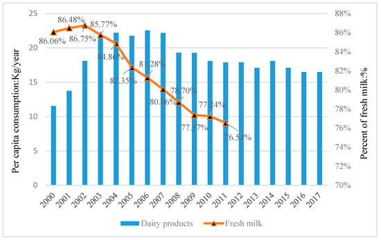 Figure 1 shows the dairy consumption and proportion of fresh milk in the total dairy consumption in Chinese urban areas. The per capita consumption of dairy products surged from about 11.55 kg in 2000 to 22.5 kg in 2007, representing an increase of 95.65% [4]. However, it fell to approximately 18 kg after the melamine scandal in 2008, remaining at this level until recent years. Fresh milk is the main consumption type of dairy production among urban consumers. Fresh milk consumption accounted for about 86% of the total dairy consumption in 2000 and 76% in 2011, and remains the main type of dairy consumption in China.