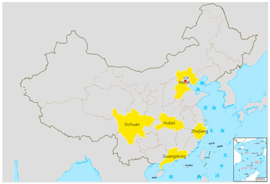 Data was obtained from nationwide face-to-face interviews conducted in July and August 2016. Respondents were chosen in a random way. We first selected five provinces, including from the north, south, east, and middle of China. Then, we chose developed cities (capital cities) and less developed cities (non-capital cities) located in these five provinces as the survey cities. They are Shijiazhuang and Chengde in Hebei Province, Guangzhou and Qingyuan in Guangdong Province, Hangzhou and Huzhou in Zhejiang Province, Chengdu and Ziyang in Sichuan Province, and Wuhan and Xianning in Hubei Province (Figure 2). These survey sites were selected to obtain a good representation of China and explore the impact of economic development on consumers’ preference for fresh milk. Before formal interviews, a preliminary test with 18 participants was conducted at a major supermarket in Hangzhou to test the feasibility of the survey design. The procedures of the survey were as follows: