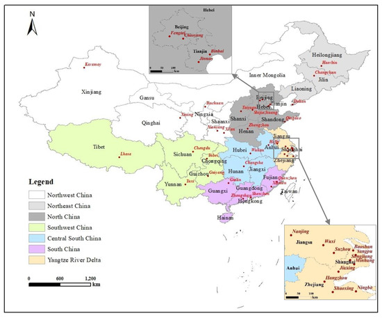 Seven subregions and 40 cities (or districts) surveyed in China. Note: Red dots on the map indicate the cities surveyed. North China consists of northwestern (Xinjiang, Gansu, Qinghai, Ningxia, Shaanxi, and Inner Mongolia), northeastern (Heilongjiang, Jilin, and Liaoning), and northern areas (Beijing, Tianjin, Hebei, Shandong, Shanxi, and Henan). South China includes southwestern (Chongqing, Sichuan, Guizhou, Yunnan, and Tibet), central–south (Anhui, Hubei, Jiangxi, and Hunan), and southern areas (Fujian, Guangdong, Guangxi, and Hainan) and the Yangtze River Delta (Jiangsu, Shanghai, and Zhejiang).