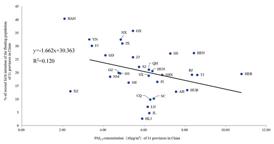 Both the fertility and natural population growth rates in China have remained at a decline over the past 20 years. Differing from previous research on the declining fertility rate of the Chinese population, which addressed the effects of demographic factors (especially age and education), Family Planning policy and rapid economic development, this study provides an environmental lens to understand the probable demographic consequence of smog risks. The findings of the study fill in part of the knowledge gap by demonstrating that the prevalence of smog significantly reduces intentions to have a second child across the Chinese floating population, and that the impact of smog on birth intentions exhibits a clear geographical discrepancy between north and south regions of China. A simple linear fit of PM2.5 concentration and second birth intentions indicates a significant negative but weak correlation between these two variables (with a coefficient of −0.064, at the 0.001 significance level) (Figure 2). Not surprisingly, air pollution in the provinces of Hebei (HEB), Tianjin (TJ), Beijing (BJ), Henan (HEN), Hubei (HUB), Shandong (SD), Anhui (AH), Shaanxi (SHX), Shanxi (SX), Jiangsu (JS), Sichuan (SC), and Chongqing (CQ) is more serious than in other provinces. At the prefectural city level, affected cities are mainly distributed in the north, northwest, central, and southwest regions of the country, which are dominated by heavy industries and arid or semi-arid climate. Overall, there are higher percentages of migrants with have second birth intentions in southern provinces (e.g., Hainan (HAN), Yunnan (YN), Fujian (FJ), Jiangxi (JX), Henan (HEN), Zhejiang (ZJ), Shandong (SD) and Guangdong (GD)) than there are of their counterparts living in northern regions. Smog can reduce fertility desire in at least two ways. Firstly, existing research has shown that if pregnant women are exposed to smog for a long time, it will damage the physical and mental development of the fetus or the newborn, and this effect will last until the childhood phase [17]. For the sake of the health of newborn babies, women at childbearing ages usually reduce or postpone their fertility intentions. Secondly, smog affects the physical and mental health status of child-bearing women [68,69]. Long-term exposure to smog causes not only a variety of respiratory diseases, but also mental health problems such as anxiety, depression and stress, thereby reducing their fertility intentions [14]. In the Chinese context, some floating populations in the northern areas (e.g., Hebei) have shown strong resilience to smog and have strong intentions to have a second child even with the increased frequency and severity of smog. This phenomenon is complex and will need further quantitative and/or qualitative research in the future to fully explain it.