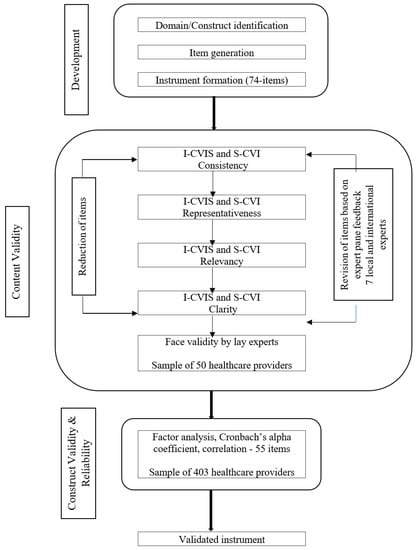 The ProSCiTE development and validation involved three processes, including ProSCiTE development, content validity by expert panels, as well as construct validity and reliability through a pilot study among a sample of healthcare providers. A flowchart of the validation process is presented in Figure 1.