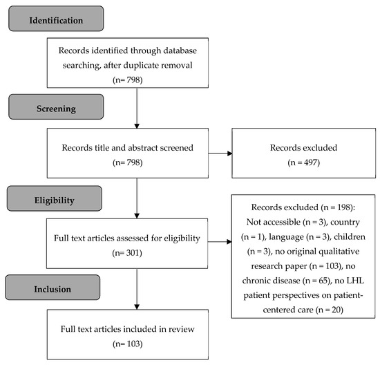 The search of online databases yielded 798 articles, after duplicates were removed. Based on the initial screening of title and abstract, 497 articles were excluded as they did not meet the inclusion criteria. The remaining 301 articles were obtained in full text if possible and assessed for eligibility. Subsequently, 198 articles were excluded, as inclusion criteria were not met. Ultimately, 103 articles were retained for the analysis (Figure 2).