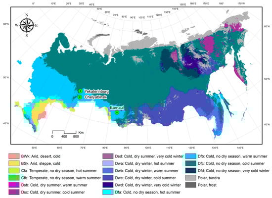 Köppen–Geiger climate classification and locations for three Russian cities: Chelyabinsk, Yekaterinburg, and Barnaul (adapted from Reference [33]).