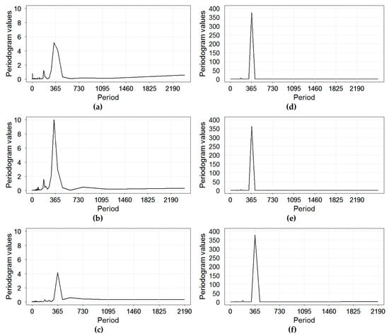 The periodogram spectral analysis for time series of daily rates of rotaviral infection (RI) (a–c) and daily ambient temperature (d–f) in three Russian cities: (a,d) Chelyabinsk; (b,e) Yekaterinburg; and (c,f) Barnaul, 2005–2011.
