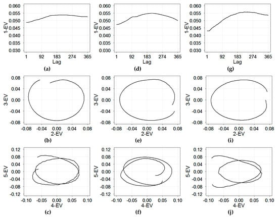 Plots of the eigenvectors (EV) pairs: 1-EV and lag, 2–EV and 3-EV, and 4-EV and 5-EV for Chelyabinsk (a–c); Yekaterinburg (d–f); and Barnaul (g–j).