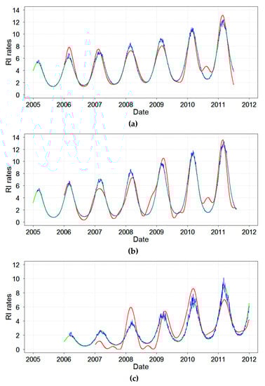 The predicted RI rates based on Model A (red line), Model B’ (green line), and Model C’ (blue line) in: (a) Chelyabinsk, (b) Yekaterinburg, and (c) Barnaul, Russia, 2005–2011.