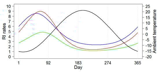 The quality of fit for the constructed models was evaluated by the coefficient of determination D, reflecting the overall proportion of variance in explained by the model components and the proximity to the Poisson-distributed residuals, , having the minimum values of the statistical characteristics (mean, median, minimum, maximum, standard deviation, and mean absolute error (MAE)). All analysis was performed using Statistica 12.0 (StatSoft Inc., Palo Alto, CA, USA) statistical software. Codes for SSA models [35] were based on the “Caterpillar” SSA algorithm and can be requested from the author (O.K.A.). The compiled dataset containing daily time series of RI rates and temperature is provided in the Supplementary Materials Table S1.