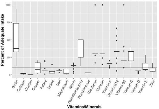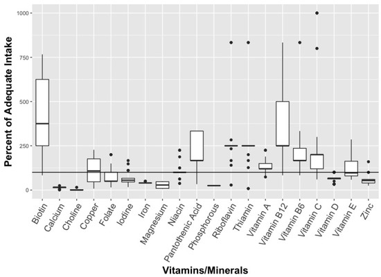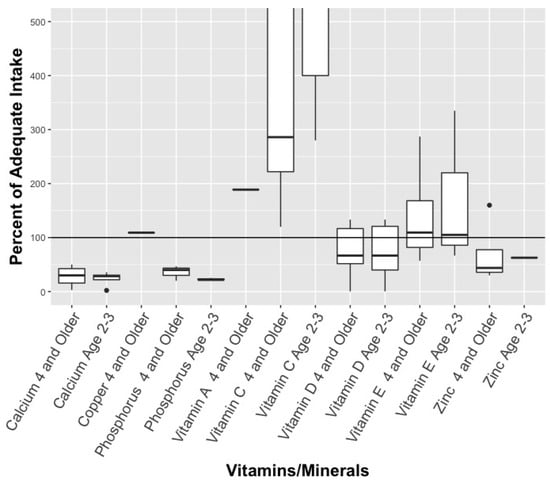 Percent of recommended vitamins/minerals for children aged 4 and up in multivitamin supplements (n = 52). * Solid line represents median estimate, with top and bottom of box representing quartiles (if sufficient data). Y—axis was truncated at 1000% to allow appropriate visualization of the estimates.