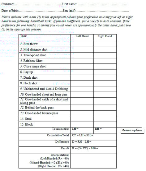 These items were entered into a format and scoring method similar to EHI to obtain a quantitative assessment and interpretation of laterality in basketball. The procedure was as follows. The response sheet presents two columns—‘left hand’ and ‘right hand’—following each item. Similar to the EHI procedures, the participant indicated the number 1 (weak preference to one hand) or 2 (strong preference to one hand) in the appropriate column box to indicate their preference for the right or left hand for a certain task. If there was no particular hand preference for an item, the participant ticked 1 in both columns. At the end of the procedure, a score of laterality was computed as R = (difference between sides/cumulative total) × 100, ranging from −100 (strongly left) to +100 (strongly right). Scores between −40 and +40 were interpreted as the mixed handedness condition as suggested by Stockel and Vater [31]; and scores lower than −40 and greater than +40 were interpreted, respectively, as left-handed and right-handed.