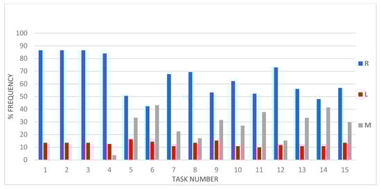 Frequency histogram showing per cent right-handed (R), left-handed (L), mixed handed (M) players in the 15 tasks of the BaHI inventory (on the x-axis).