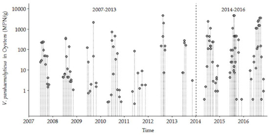 Oyster samples were collected from the two oyster beds at NI and OR except during the period January–March from June 2007 through December 2016. For each sampling date, 10–12 oysters were cleaned and aseptically shucked into a sterile beaker (liquor and meat), weighed and diluted 1:1 with alkaline peptone water (APW (pH 8.6, 1% NaCl), and homogenized. A volume of 20 mL homogenate was further diluted in 80 mL APW for a starting dilution of 1:10. A volume of 1 mL of 1:10 solution was added to three tubes and then serially diluted with 1 mL aliquots into three serial dilutions containing 9 mL APW (pH 8.6, 1% NaCl). Each tube was incubated at 37 °C overnight (18–20 h) following the U.S. Food and Drug Administration Bacteriological Analytical Manual (BAM) [42].