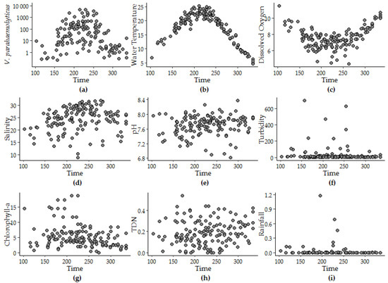 Patterns in (a) V. parahaemolyticus concentration, (b) water temperature, (c) dissolved oxygen, (d) salinity, (e) pH, (f) turbidity, (g) CHL, (h) TDN, and (i) rainfall versus the calendar day of the year superimposed from 2007 to 2016.