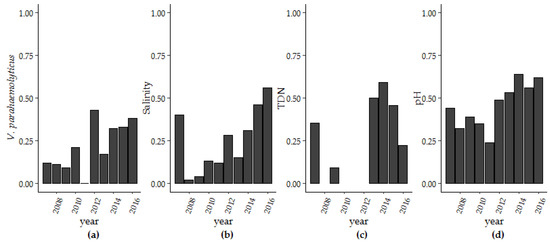 Salinity and water temperature are both seasonally variable parameters that, together are the most commonly cited environmental drivers of V. parahaemolyticus concentration variation [16,31,67]. Salinity was a significant predictive parameter for V. parahaemolyticus concentration in this study, though the significance of salinity was dependent on the time interval (2007–2013 versus 2014–2016) of the data and the trend adjustment in the model (Table S2). This type of variability has also been observed in risk assessment [68,69] and in previous studies where salinity sometimes shows a strong positive correlation with V. parahaemolyticus [5,6,25,63], whereas for others [28,53,60,70], salinity and V. parahaemolyticus dynamics do not correlate. Thus, the finding that salinity and other variables reported to be significant in other V. parahaemolyticus concentration models were not included in this study’s final model may be, at least in part, a function of both the specific conditions at this study site and time period and a function of the in-depth statistical approach used.
