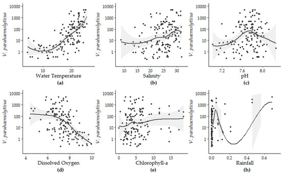 Loess smoothing applied to V. parahaemolyticus concentrations and (a) water temperature, (b) salinity, (c) pH, (d) DO—dissolved oxygen, (e) CHL—chlorophyll-a, and (h) rainfall.