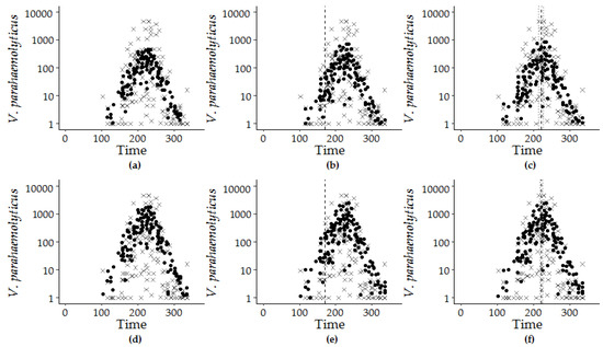 Model estimations (filled circle) and observed V. parahaemolyticus concentrations (x) are superimposed by the calendar day of the year from 2007 to 2016: GLM-G for (a) Model 7.4, (b) Model 8.1, and (c) Model 9.1 and GLM-NB for (d) Model 7.4, (e) Model 8.1, and (f) Model 9.1. The dashed vertical line at day 170 for the hybrid model (b,e) marks the longest day of the year, and the dashed lines at day 222 ± 5 days and at day 221 ± 7 days indicate the calculated peak timing of V. parahaemolyticus concentration for Model 7.1 for (c) GLM-G and (f) GLM-NB versions.