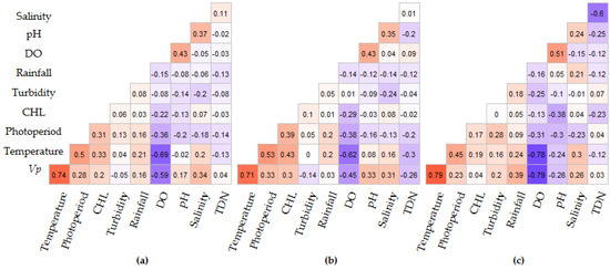 Spearman correlation analysis of V. parahaemolyticus concentrations and environmental variables for three intervals: (a) 2007–2016, (b) 2007–2013 and (c) 2014–2016. Red indicates positive and blue negative correlations and the degree of significance is highlighted by color intensity.