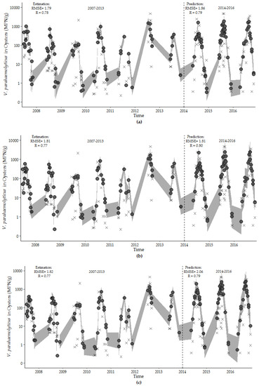 Estimates of V. parahaemolyticus concentrations (closed circle) with observed V. parahaemolyticus concentrations for: (a) environmental model, (b) hybrid model, and (c) harmonic regression model for the training (2007–2013) and test (2014–2016) periods. The 95th percentile prediction interval is represented by the gray shading. Model fit values are shown in the upper left corner of each figure.