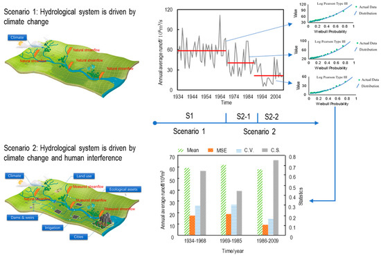 Hydrological statistics are widely employed in water resources planning and management around the world currently [1], in which the stationarity assumption of a hydrological time series is fundamental, influencing the effectiveness of water resources management [2]. Stationarity is predicated upon an assumption that the generating process is in equilibrium around an underlying mean and that variance remains constant over time [3]. With the climate change and human activities in river basins, water management professionals have been counseled to abandon historical assumptions of stationarity in the natural systems governing surface water replenishment [3]. For example, Milly et al. [4] claimed that stationarity is dead and could not be revived because of the substantial anthropogenic change of the Earth’s climate altering the means and extremes of precipitation, evapotranspiration, and rates of discharge of rivers. After that, the claim was questioned by some scholars, and some issues that can be discussed were put forward regarding whether stationarity is indeed dead or now has only a secondary statue. Matalas [5] stated that stationarity is always a part of the composition of a time series, explicit or otherwise. Stationarity may be overlooked, but it remains alive and well. Furthermore, the operational assumption of hydrologic stationarity used extensively in water management should not be discarded without further study [5]. Chung et al. [2] reported that the fundamental cause of this climatic change is the warming temperature, and further noted no apparent change in the runoff for the last century. Although it is uncertain as to whether stationarity is dead or alive, it is well known that human activities and climate change have a significant impact on runoff and other hydrological processes [6,7], which implied how to use the nonstationary runoff records to implement hydrological frequency analysis.