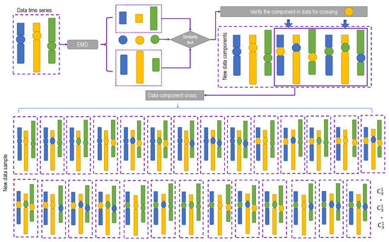 The cross procedure comes from the genetic crossover in genetic algorithms (GAs) simulating Darwin’s genetic selection and the natural selection process of biological evolution. In this paper, the cross was carried out among the segmentations in the verified IMFs, shown in Figure 2, and nn (n is the number of segmentation) data samples can be obtained.