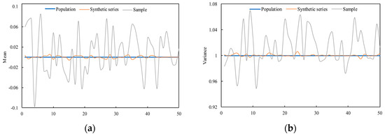 Changes in the mean (a) and variance (b) of 50 experimental samples, a synthetic series, and the population.
