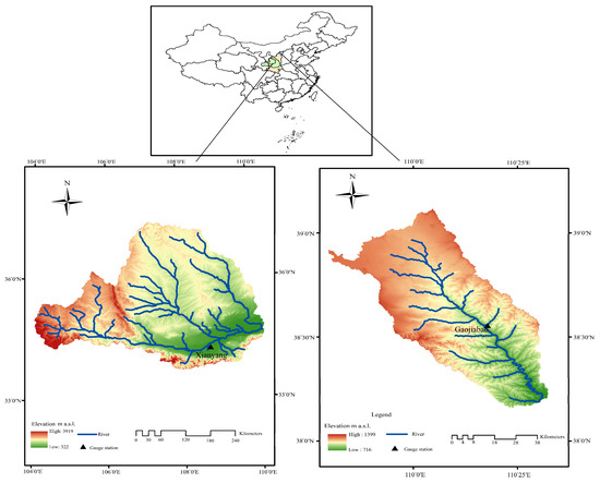 The data used in this paper include the monthly measured runoff at Xianyang hydrological gauge (Figure 5) on the mainstream of the Wei River and Gaojiabao hydrological gauge (Figure 5) on the Tuwei River. The runoff data series of Xianyang gauge is from 1956 to 2000, and that of the Gaojiabao gauge covers 1976–2010. Through the data at two gauges, the hydrological characteristics of the two different regions or basins can be represented, which also have the advantage of verifying the applicability of the method in various regions. The data was obtained from hydrological manuals published by the Hydrological Bureau of the Yellow River Conservancy Commission.