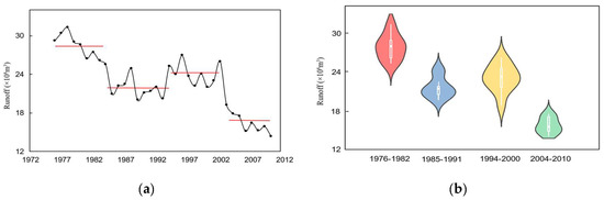 Segmentation of runoff series and their violin figures at Gaojiabao gauge. (a) the runoff series of each segment; (b) the violin figures of each segment.