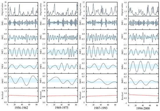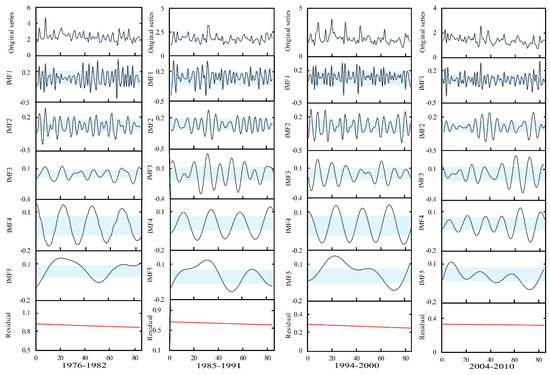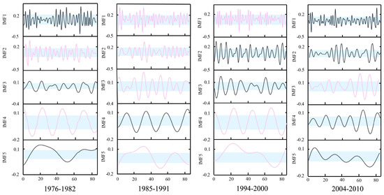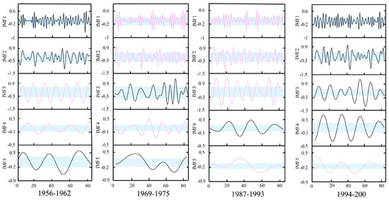 Figure 11 shows the similar IMFs at Xianyang gauge. It can be seen from the graph that there are similarities between the IMF1s in 1969–1975 and 1987–1993, IMF2s in 1969–1975 and 1987–1993, IMF3s in 1956–1962 and 1987–1993, IMF4s in 1956–1962 and 1969–1975, and IMF5s in 1987–1993 and 1994–2000. The results at Gaojiabao gauge are displayed in Figure 12. It was found from the graph that there are similarities between IMF1s in 1985–1991 and 1994–2000, IMF2s in 1976–1982 and 1985–1991, IMF3s in 1985–1991 and 2004–2010, IMF4s in 1976–1982 and 1994–2000, and IMF5s in 1985–1991 and 1994–2000. According to the results, the cross will be implemented between similar IMFs for further reconstruction.
