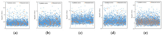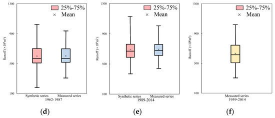 In this study, two hydrological gauges in different basins were selected for the study. However, owing to the two basins being relatively close, the result could be not convincing. Thus, Xiangtan gauge (112°93′ E, 27°83′ N) at Dongting Lake in southeast China was selected as the third case study for further verification, which has an annual runoff series covering 1959–2014 that was selected for the calculations. The change-point test result showed that the change points in the series appeared in 1988. Then, the annual runoff series were divided into two segments as 1962–1987 and 1989–2014. Next, the CR method was used to expand the data in two segments, and the synthetic runoff data series are shown in Figure 17 with measured data. It can be seen from Figure 17a,b that the synthetic series covered the measured series as well. The parameter comparison was demonstrated in Figure 17d,e where the minimum value of the synthesis series is very close to that of the measured series, and the maximum value of the synthesis series is a little larger than that of the measured series. In addition, the values of 25%, 50%, and 75% of the synthetic series are close to these of the measured series, indicating that the synthetic series is similar to the measured series. Figure 17c,f present the whole runoff series from 1945 to 2013 and its statistics. From the figures, it can be found that the synthetic series covered all the original measured series, and more high flow and low flow occurred in the synthetic series than in the original series.