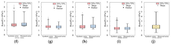 Scatter diagram (a–d) and boxplots (f–i) of the synthetic series and measured series in four segments at Gaojiabao gauge; (e) a scatter diagram of all the synthetic data and the whole original measured data; (j) the boxplots of the whole series.