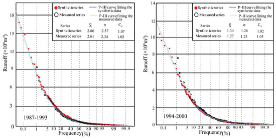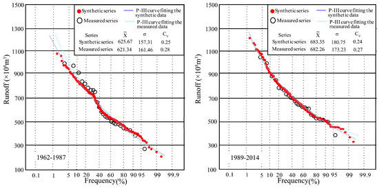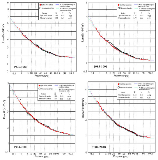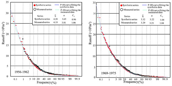 The purpose of data expansion is to improve the frequency analysis of small-sample hydrological data. Thus, the Pearson type III (P-III) distribution was employed to detect the difference between the synthetic and measured series. The statistical parameters of P-III distribution at Xianyang gauge are shown in Figure 15. From the figure, it can be seen that the P-III parameters of each segment in the synthetic series are very close to those of the measured runoff series, implying that the CR synthetic series is consistent with the measured series. Drawing P-III curves of the synthetic and measured series in Figure 15, it was found through the comparison between the two curves that the distribution of each segmented synthetic and measured series has good similarity, but the fitting curves have a certain deviation on the return period of extreme wet events (once-in-a-century and millennium). Due to the length of the measured series data being relatively short, there is a lack of extreme wet events, and thus the frequency values would usually be uncertain through the fitting curve. However, the synthetic series contains more data, closer to the data population, and so the frequency values obtained by the P-III curve fitted by the synthetic series will be more reliable than those from the measured data and are suitable for use in engineering design.