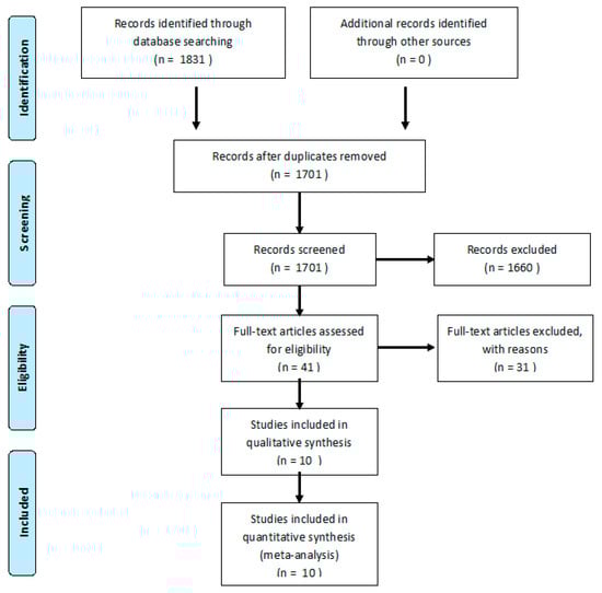 From a total of 1831 articles, 1701 were analyzed after removing duplicates. In total, 293 women were evaluated for SUI, with PFMT or control protocol. After the evaluation of 1701 abstracts from primary sources, 1660 were excluded and 41 were assessed as full texts. From these, 31 studies were excluded. Thus, 10 RCTs (n = 293 women) were included [41,42,43,44,45,46,47,48,49,50]. The flow diagram showing the process of study selection is shown in Figure 1.
