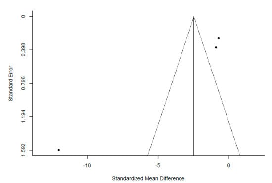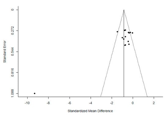 The methodological quality of the randomized trial studies was assessed according to the PEDro scale [33,34,35], using the following criteria: (1) the eligibility criteria were specified; (2) the participants were randomly assigned to the groups (in a crossover study, the participants were randomly assigned to treatment groups); (3) the assignment was hidden; (4) the groups were similar at the start of the study in relation to the most important prognostic indicators; (5) all the participants were blinded; (6) there was blinding of all the therapists that administered the therapy; (7) there was blinding of the evaluators that measured at least one key result; (8) measurements of key results were obtained from more than 85% of the participants that were initially assigned to the groups; (9) all the participants whose results were available received treatment or were part of the control group according to which they were assigned to, or when this was not the case, the data for at least one key result were analyzed by ‘intention-to-treat’; (10) the results of the statistical comparisons between groups were reported for at least one key result; and (11) the study provided both specific and variability measurements for at least one key result. Due to the characteristics of the studies, points 4 and 5 were not evaluated. The publication bias was evaluated through an asymmetry test as estimated from a funnel plot (Figure 2). In addition, Egger’s test was used to assess publication bias.
