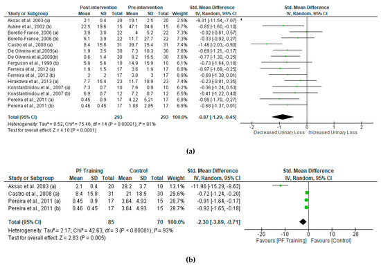 Standardized mean difference (SMD) (a) between post- and pre-intervention urinary loss in women who received PFMT and (b) post-intervention intervention urinary loss in women who received PFMT. Squares represent the SMD for each trial. Diamonds represent the pooled SMD across trials.