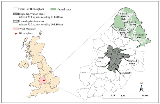 Left: location of Birmingham in the United Kingdom (the United Kingdom map adapted from the work of [53]); right: locations of low- and high-deprivation areas in Birmingham. Adapted from the work of [13].
